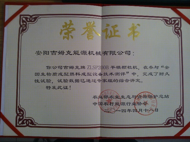 經過全體17c一起官网人的努(nǔ)力,我公(gōng)司ZLSP200B型顆粒機通過了由“農業部農業生態與(yǔ)資源保護總站”和“中(zhōng)國(guó)農村能源行業協(xié)會”聯合組織的“全國生物質成(chéng)型燃料成型設備技術測評”。根據(jù)測評結(jié)果,我們(men)公司的ZLSP200B型顆(kē)粒機連續工作300小時正(zhèng)常,完成(chéng)了耐(nài)久性試驗,試驗數據已經得到了專家組的認可。